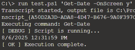 C:\> run paramtester.ps1 "-Name 'User One' -Age 99 -City OOO"