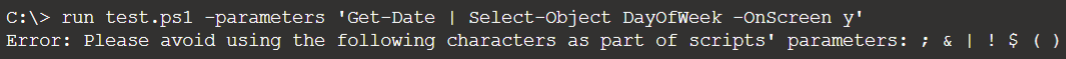 Error: Please avoid using the following characters as part of scripts' parameters: ; & | ! $ ( )